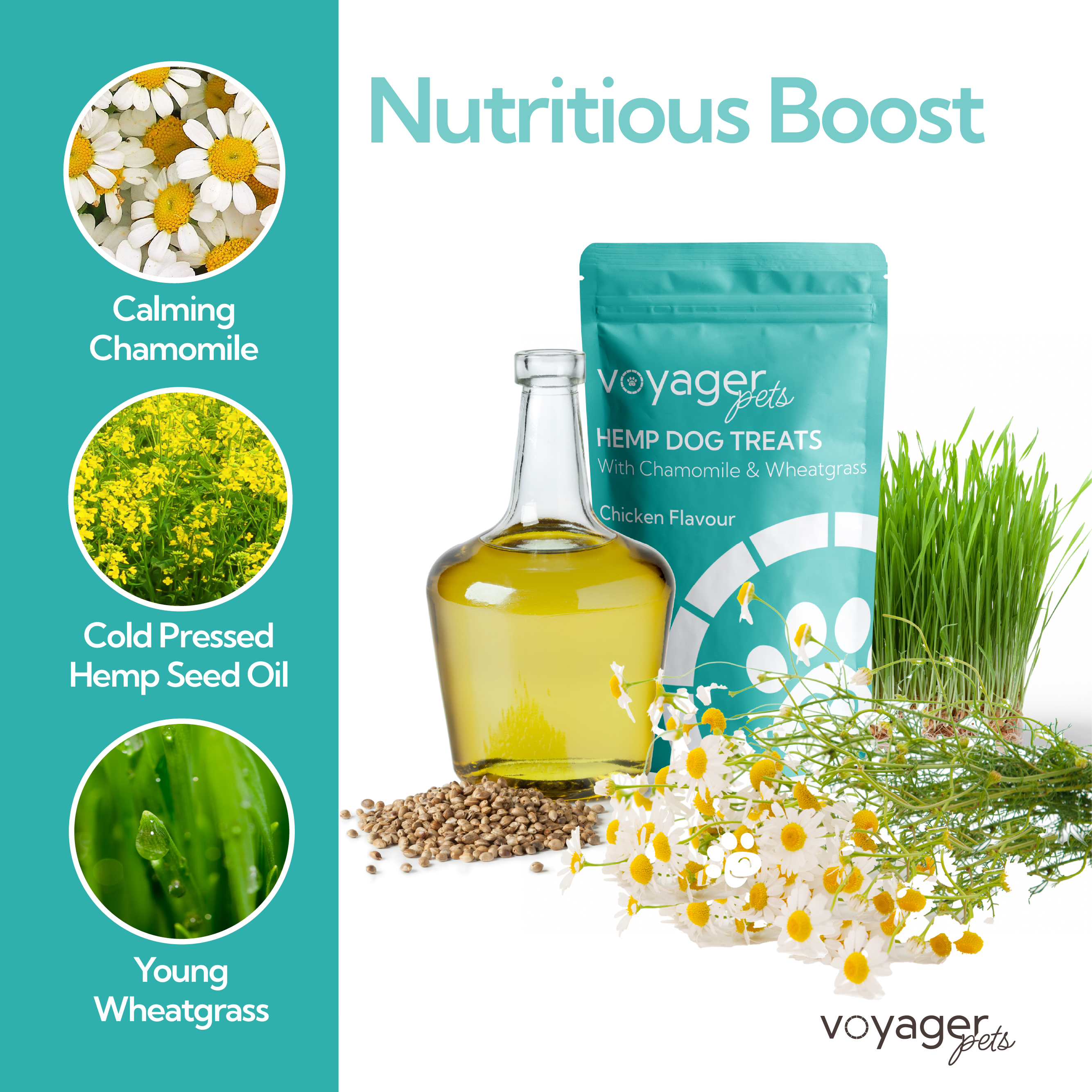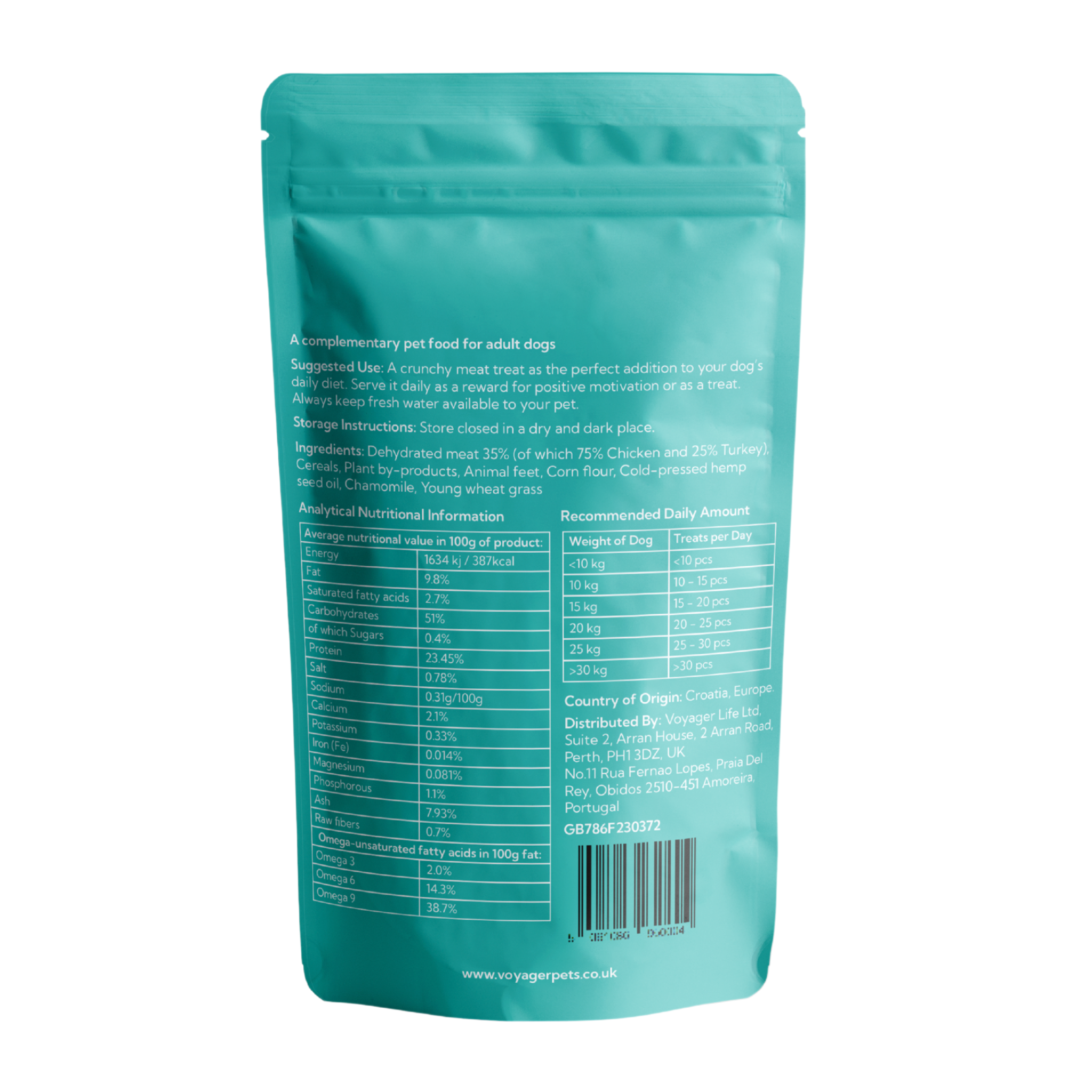 These crunchy, chicken-flavoured hemp dog treats are a tasty and wholesome reward for adult dogs. Made with quality ingredients, including cold-pressed hemp seed oil, chamomile, and young wheatgrass, they’re ideal as a complementary addition to your dog’s daily routine. Each pack comes in a resealable pouch to keep the treats fresh and easy to store.