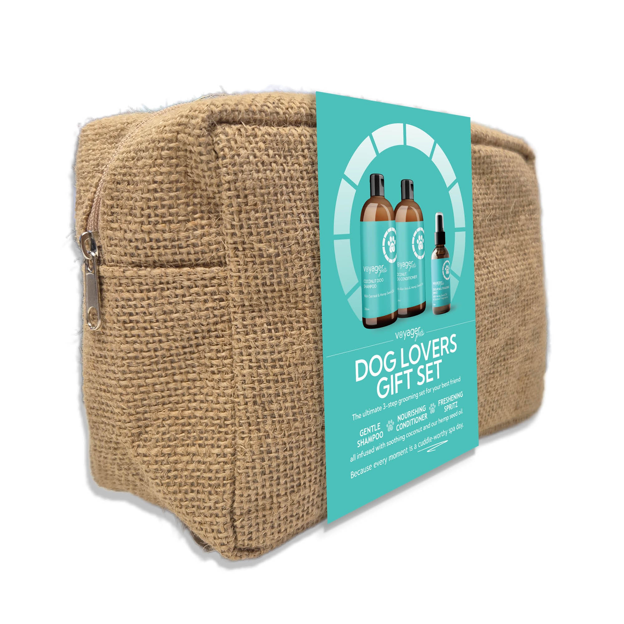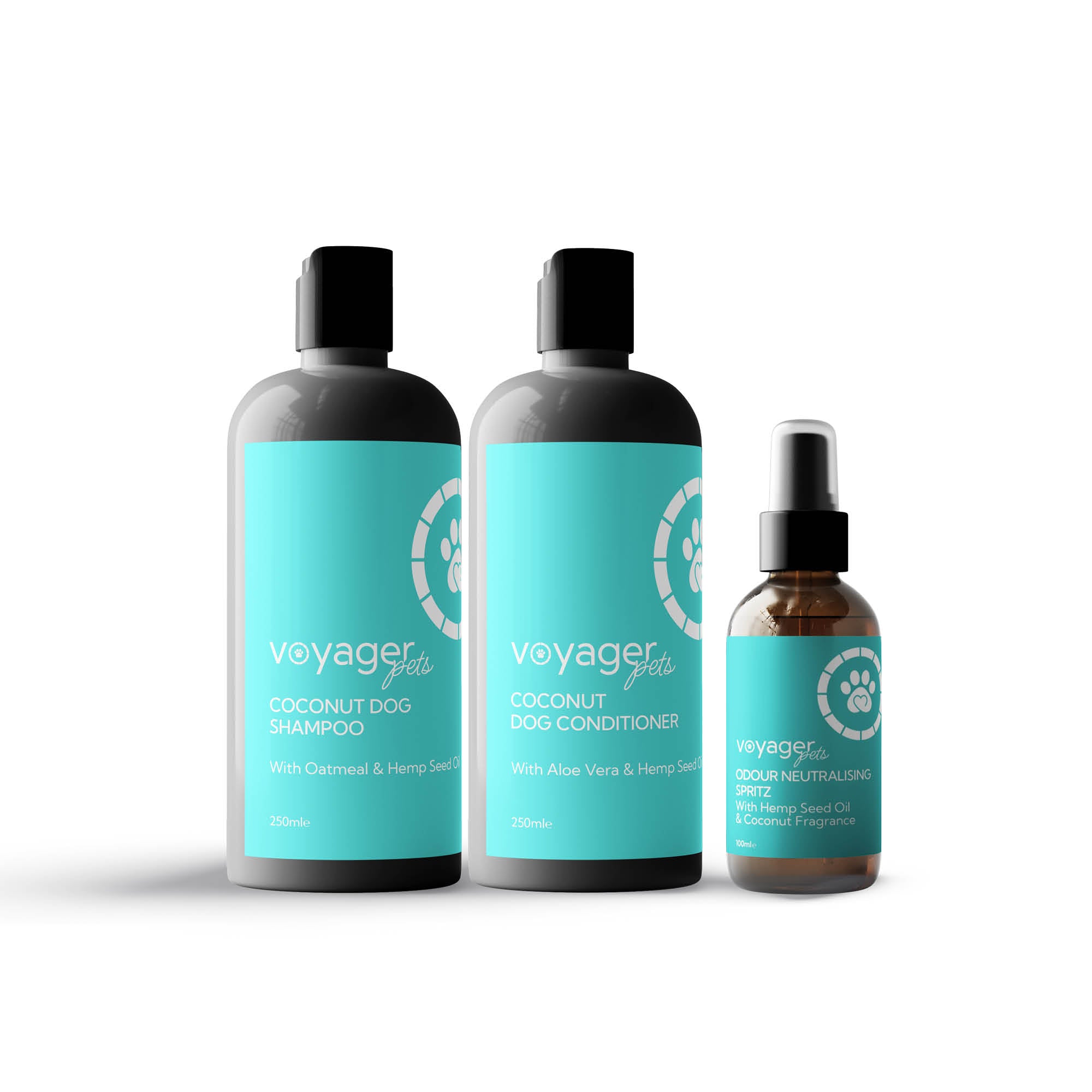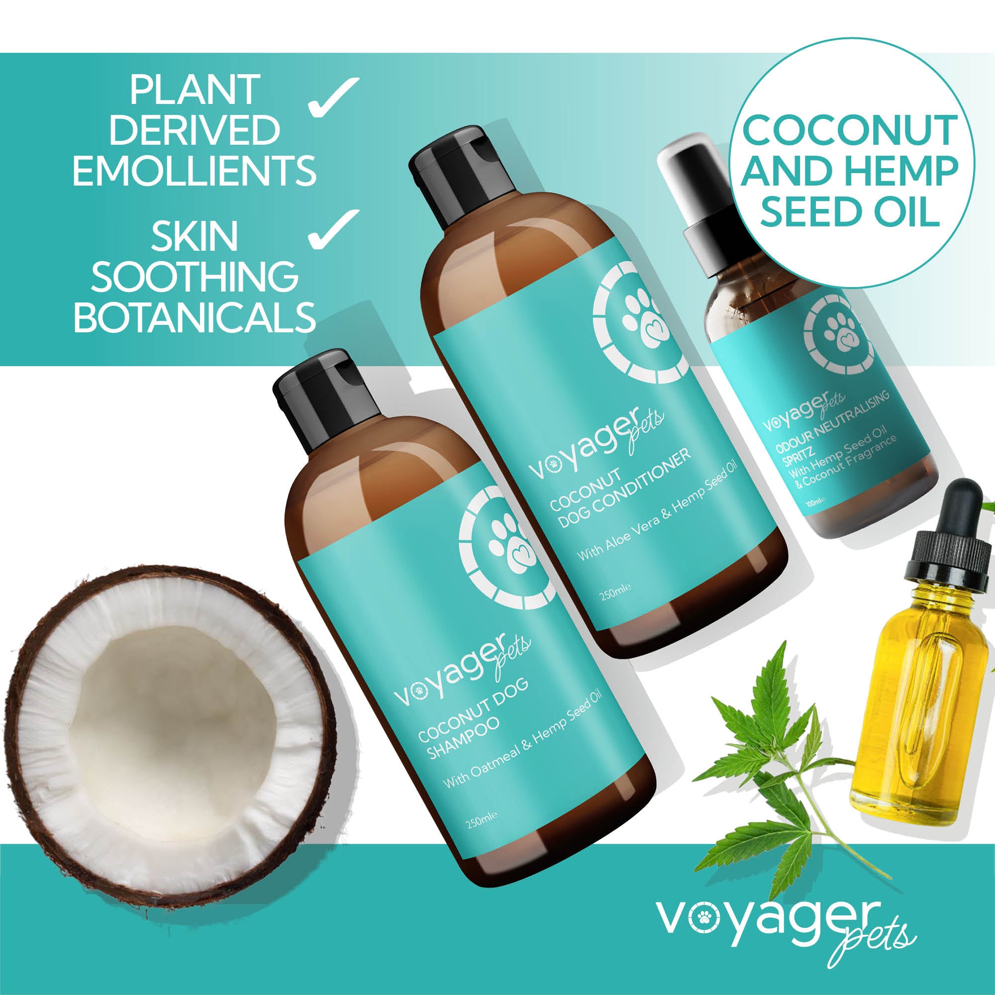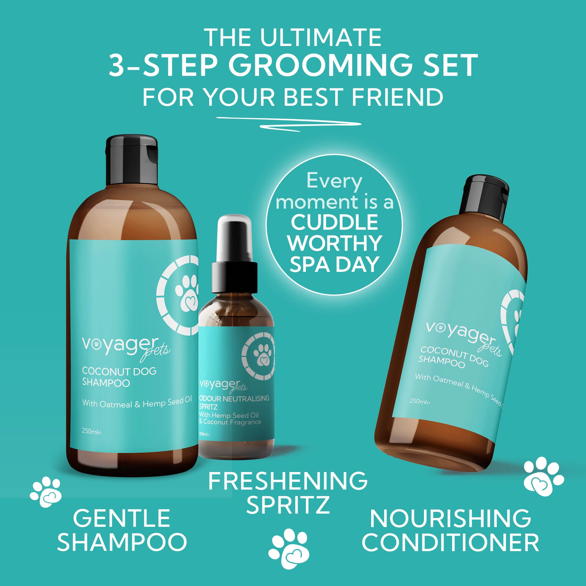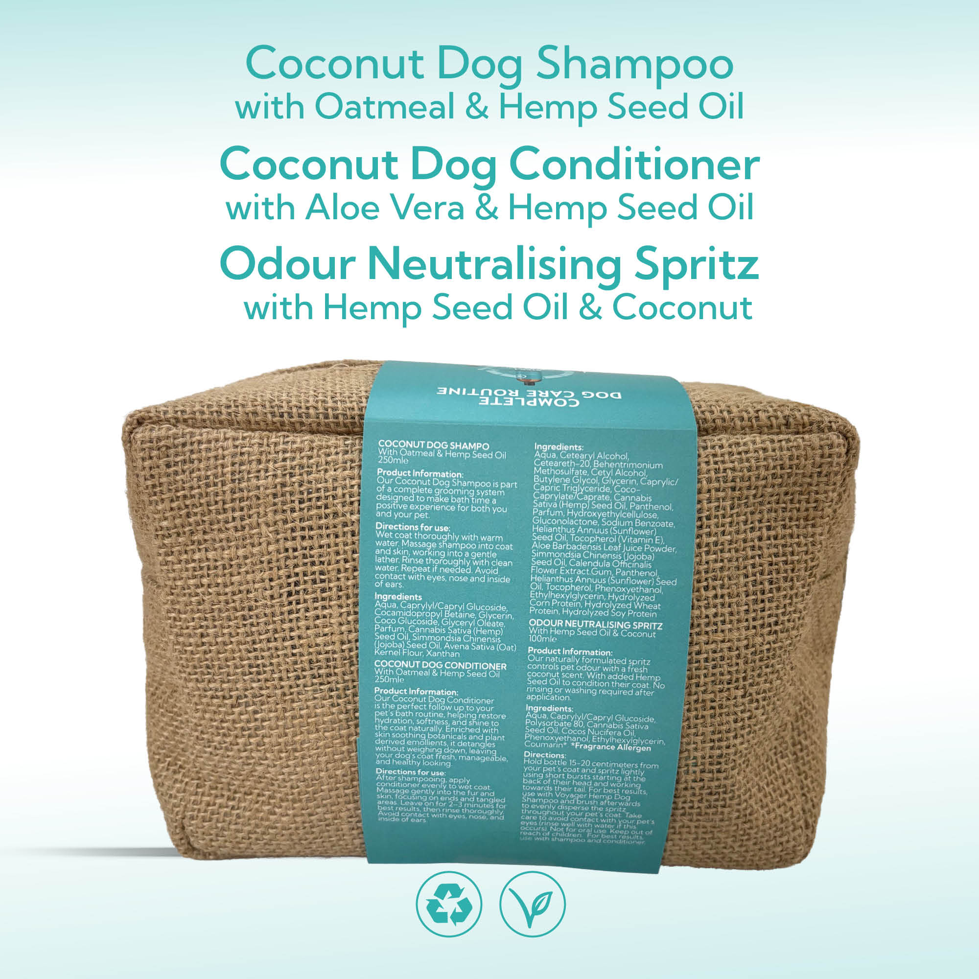 Our ultimate 3-step grooming set for your best friend including 1 x 250ml Coconut Dog Shampoo, 1 x 250ml Coconut Dog Conditioner and 1 x 100ml Odour Neutralising Spritz all infused with soothing coconut and hemp seed oil and encased in a smart and useful natural jute bag.